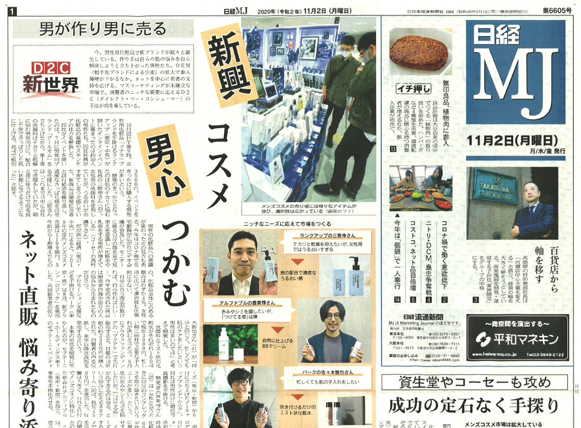 「日経MJ」(一面)で、R_hommeとメンズスキンケア講座が掲載されました。